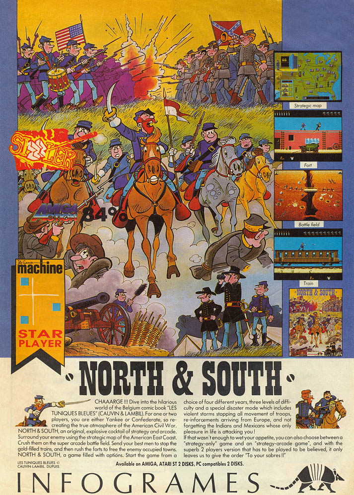 Veniamo quindi al gioco, rilasciato nel 1989 dalla francese Infogrames per Amiga, ST, Commodore 64, DOS, MSX, CPC 464, NES e ZX Spectrum. Ideato e programmato da un team di sviluppatori d’oltralpe, il gioco deriva le sue radici da un fumetto belga degli anni ’70, Les tuniques bleues, che a sua volta racconta in tono ironico scorci della crudele guerra civile americana (1861-1865).