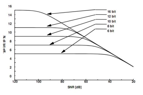 Come si può vedere, all’aumentare del rumore (e quindi al peggiorare del SNR) il vantaggio di avere, ad esempio, 16 bit anzichè 14 o 12, si riduce velocemente e la riduzione è tanto più rapida quanto più è elevato il numero di bit. Questo comporta che è inutile avere convertitori con elevata risoluzione nominale, in presenza di un’elevata cifra di rumore generata internamente o esternamente al dispositivo di campionmento e quantizzazione e che, all’aumentare del numero di bit, ovvero della risoluzione nominale, per poter avere reali benefici è necessario implementare circuiti e relati algoritmi di filtraggio del rumore sempre più sofisticati e costosi.