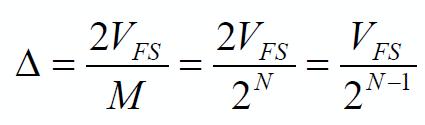 (nella seconda immagine si hanno solo 4 livelli, ovvero 2 bit ma non cambia nulla ai fini di ciò che si vuole dimostrare), si ha che, definendo con DELTA l’ampiezza di ciascun livello, con V(fs) la tensione massima di fondo scala, con N il numero di livelli, si ha che