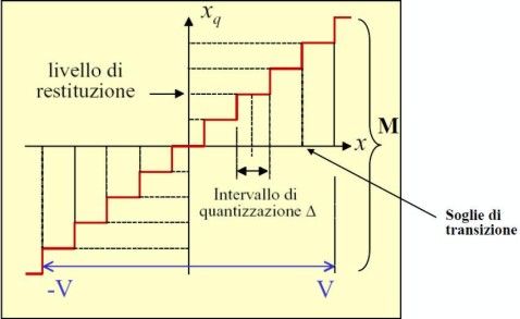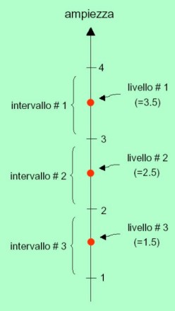Terminata questa digressione, torniamo al processod i digitalizzazione di una grandezza continua. Quello che si deve fare è trasformare una curva in un aserie di valori numerici. Per farlo, si procede prima con l’individuazione di campioni significativi di quella curva che permettano di ricostruirne tutte le caratteristiche e le peculiarità, possibilmente senza perdere informazioni (ma abbiamo visto che questo non sempre è possibile). Questo primo passo è detto campionamento; il secondo step è quello di assegnare a ciascuno di questi campioni un valore numerico. Per farlo si definisocno una serie di intervalli, ognuno dei quali corrispondente ad uno dei campioni individuati e, ad ogni intervallo, si assegna un valore numerico. Appare evidente, a questo punto, che le quantità di intervalli (e quindi di campioni) e quello di valori numerici corrispondenti devono per lo meno, concidere, se non si vuole avere la certezza di perdere informazioni nell’eseguire la quantizzazione. A causa degli errori che introduconmo, le operazioni di campionamento e quantizzazione sono molto delicate e rappresentano il cuore dell’elaborazione numerica dei segnali.