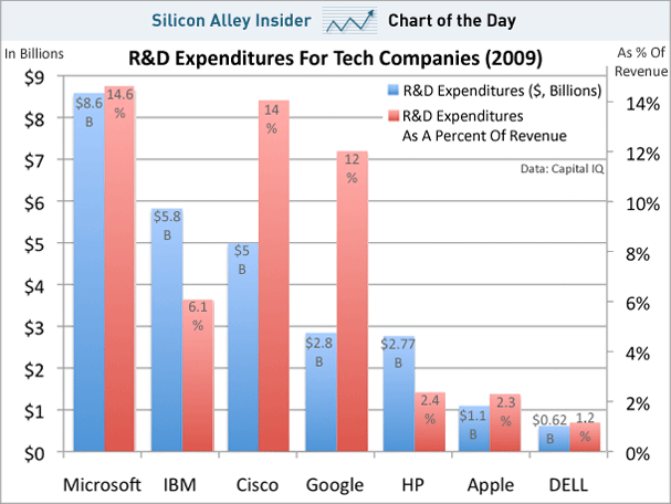 Al di fuori di questi segmenti – per esempio nel search e nel mondo smartphone – l’azienda fondata da Bill Gates e Paul Allen si trova ad affrontare una concorrenza molto agguerrita. Com’è evidente dal grafico che riporto qui sotto, questa concorrenzialità si traduce in una fortissima spesa R&D, in assoluto e in rapporto alle revenue. Fortissima specialmente al confronto delle spese R&D sostenute da Apple.