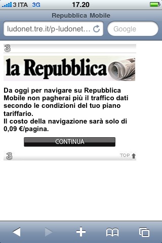 Come accennavo, intuisco i motivi che hanno ispirato questa restrizione: da un lato iPhone è un terminale con una vocazione online molto elevata, dall’altro 3 ha offerte dati molto aggressive. La risultante di questi due fattori è che probabilmente Repubblica e Corriere vedono arrivare molto traffico da iPhone 3.