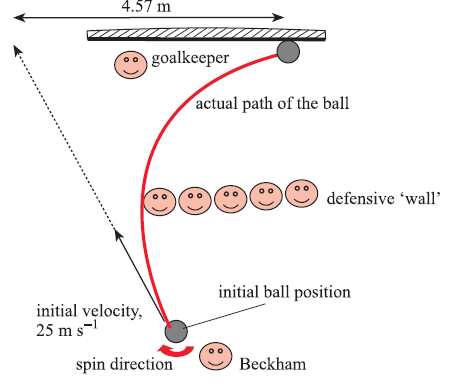 Vediamo per esempio l’articolo “David Beckham è un fisico?“. L’articolo vuole spiegare come è possibile che il calciatore riesca a tirare una palla curva che gira attorno al muro difensivo per arrivare direttamente nel gol, come rappresentato nella figura qui sotto.