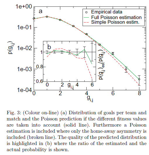 Questo fattore è però più prevedibile e misurabile rispetto a eventi indipendenti avvenuti durante una partita, e quindi è possibile predire con un certo livello di confidenza il risultato del match. Oltre alla condizione fisica della squadra, questi ricercatori hanno tenuto conto anche del vantaggio ottenuto dal giocare in casa, in dipendenza dal momento nella stagione calcistica in cui si svolge la partita. Il risultato è molto incoraggiante: i dati sperimentali (in questo caso la conta dei gol) seguono con molta precisione le previsioni statistiche presentate nell’articolo, come si può vedere nell’immagine qui sotto: