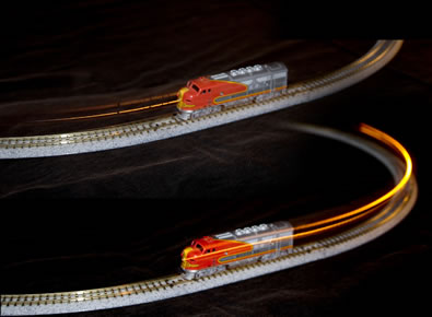 Nella parte inferiore invece l’ otturatore si apre , la luce viene catturata durante il movimento del vagone dopodiché la luce del flash congela il movimento della locomotiva.La sincronizzazione con la seconda tendina del flash permette quindi un uso molto creativo del flash , si puo’ tracciare un movimento e congelarne solo l’ istante finale quasi come se fosse un cortometraggio compresso in un unico fotogramma.