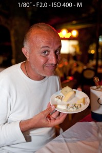 Grazie al TTL la luce del flash lavora in automatico , personalmente consiglio a seconda del caso di sottoesporre il TTL del flash di 1/3EV fino ad 1EVper togliere un po’ di presenza del lampo sopratutto sui visi.Nello scatto d’esempio (1DsmkIII con 35F1.4L e 580EX) ho scelto un tempo relativamente lento (seppur piu’ veloce del solito 1/60″) essendo un ritratto di una persona seduta ad un tavolo ripresa con un grandangolo da 35mm , un diaframma abbastanza aperto per avere uno sfondo sfocato (ed evitare dettaglio e quindi confusione) seppur chiuso di uno stop rispetto a quanto sarebbe successo lavorando in Tv ed una sensibilità di 400 ISO per non far risaltare solo gli spot delle lampadine alle spalle del soggetto ma riempiendo lo sfondo con qualche elemento in piu’ (rispetto ad avere uno sfondo nero con spot come nella foto del paragrafo Tv).