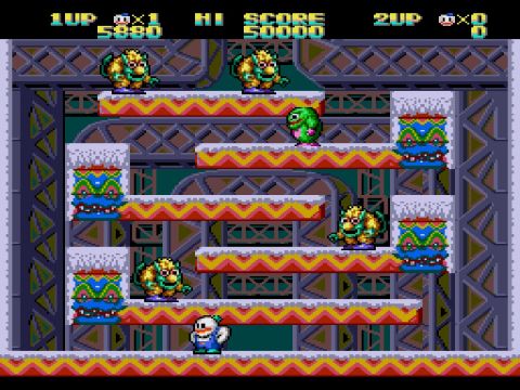 Due giocatori, in questo caso con le sembianze di pupazzi di neve animati, di nome Nick e Tom, con tanto di simil-salopette (Mario anybody?) devono salvare le loro belle rapite da testoni di pietra sputacchianti. In effetti non è un’immagine troppo confortante…