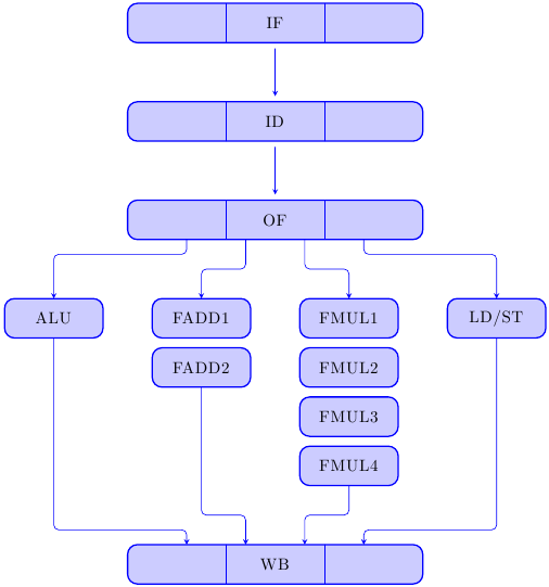 Allargare il datapath ci offre quindi un’interessante opportunità: fare sì tante pipeline affiancate, ma diverse, ognuna specializzata per una diversa classe di istruzioni. La pipeline per l’esecuzione degli interi potrebbe essere composta da solo uno o due stadi, mentre le pipeline per le operazioni floating-point sarebbero più lunghe e più complesse.