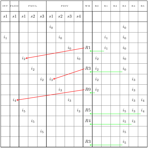 - nel frattempo la seconda istruzione (i1) non ha alcun conflitto con i0 e può partire, occupando per un solo ciclo la pipeline degli interi; essa blocca il registro di destinazione R1 per due cicli, aggiornandolo e rilasciandolo al terzo ciclo (freccia verde)