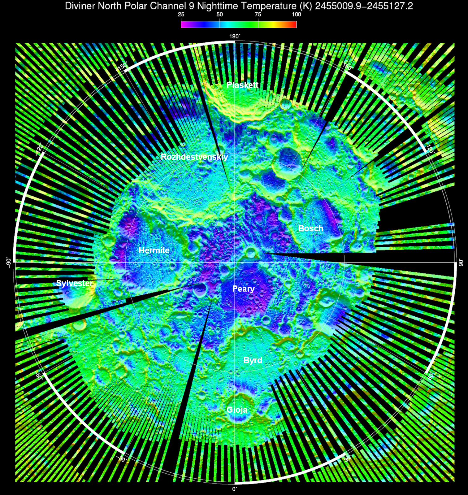La prima immagine, riportata qui sopra, mostra il punto più freddo dell’intero sistema solare. Lo strumento Diviner, che ha il compito di misurare la temperatura della superficie lunare, ha misurato una temperatura di ben -248 gradi Celsius sul fondo del cratere Hermite, attestando così il punto più freddo ad oggi misurato nell’intero sistema solare. La superficie di Plutone, infatti, risulta essere “solo” -184 gradi Celsius. Poiché l’asse di rotazione della Luna è solo 1.54 gradi, sulla superficie lunare si nota appena il susseguirsi delle stagioni. Il cratere Hermite è vicino al polo nord del satellite, che non è quasi mai esposto alla luce solare. Il fondo del cratere non ha probabilmente mai visto la luce, e risulta essere quindi estremamente freddo, come si vede dagli aloni rosati nell’immagine qui sopra. Gli altri crateri circostanti, come il Peary, sono altrettanto freddi, con solo qualche grado di differenza.