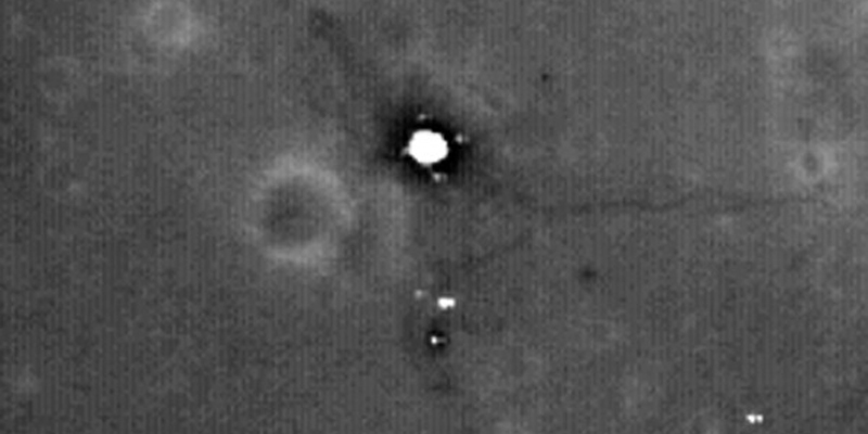 Un’altra immagine particolarmente interessante, soprattutto rivolta agli scettici del primo allunaggio dell’Apollo 11, è quella che mostra i passi effettuati dagli astronauti Neil Armstrong e Buzz Aldrin attorno al punto di allunaggio della capsula. La foto qui sopra mostra una zona lunga orizzontalmente circa 200 m, e le linee scure sono proprio il segno lasciato dal passaggio degli astronauti e del loro strumenti.