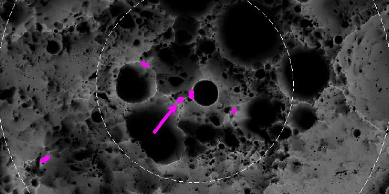 L’ultima immagine di cui voglio parlare è stata scattata agli antipodi della prima, ovvero nei dintorni del polo sud della Luna. Quest’immagine si ricollega a uno degli scopi principali della missione LRO, ovvero trovare delle zone di interesse per una futura colonizzazione umana del nostro satellite. In questo caso le zone indicate in fucsia mostrano dei punti di elevata altitudine nei dintorni del polo sud. A causa della minima inclinazione dell’asse di rotazione della Luna questi punti sono esposti alla luce solare per circa il 97% del tempo. In alcune zone il Sole è tramontato per un totale di 24 ore nel corso di quasi un anno. La ragione per cui queste zone sono di particolare interesse è ovvia. Il Sole non offre solo calore, altamente necessario all’uomo, ma è anche una fonte inesauribile di energia.