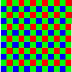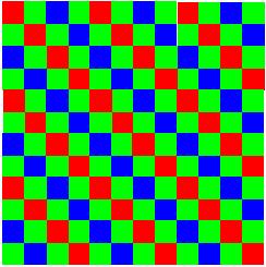 A titolo di esempio, facciamo un confronto tra due tipi di CFA, uno di tipo bayer e uno di tipo bayer modificato. I due CFA sono riportati, nell’ordine, in basso