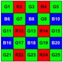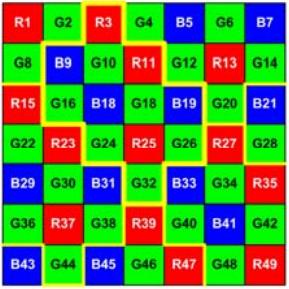 In una matrice di questo tipo, le 3 componenti RGB si ripetono seguendo sempre lo stesso schema su tutta la superficie del filtro. Una variante dell’array du tipo bayer è la Pseudo-Random Bayer (PRB), in cui la caratteristica “pseudo random” è dovuta alle posizioni dei pixel rossi e blu, variabili all’interno della griglia. Dalla figura sottostante