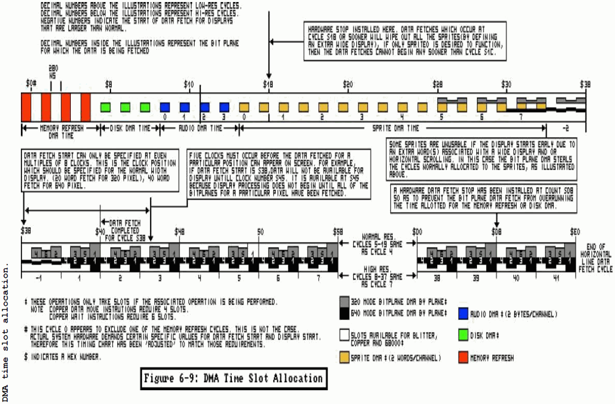 Infatti la circuiteria di refresh della memoria, il disco, l’audio e gli sprite utilizzano soltanto slot dispari, mentre il display predilige sempre gli slot dispari, ma se ne ha bisogno può utilizzare tranquillamente anche quelli pari (anzi, li può anche sfruttare tutti, lasciando a bocca asciutta CPU, Copper, e/o Blitter, come già detto nel precedente articolo).
