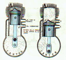 L’aria ed il combustibile vengono premiscelati ed aspirati in genere nel carter, il quale assume il ruolo di “parziale sovralimentatore” dal momento che durante la fase di discesa del pistone, questo opera una compressione della carica accumulata nel carter (per questo motivo anche chiamato “carter-pompa”) forzando il ricambio attraverso la successiva apertura della luce di lavaggio (collocate a sinistra nel disegno).