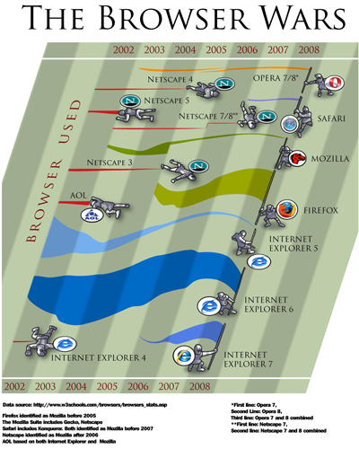 Basta un triennio per far si che dal dominio di Netscape si passi ad una penetrazione di Internet Explorer vicina al 50%, mentre il browser di Andreessen vede calare costantemente il numero di utilizzatori così come il numero di installazioni.