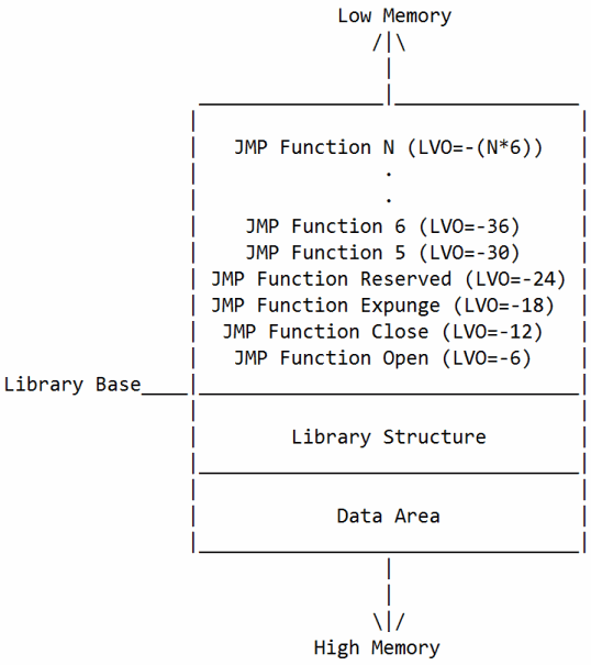 Quindi la OpenLibrary restituirà un Library Base diversa per ogni task, che conterrà la medesima tabella dei vettori (che verrà semplicemente ricopiata ogni volta), ma Data Area nuova, inizializzata opportunamente (nel codice dell’API interna con offset -6, che abbiamo visto prima).