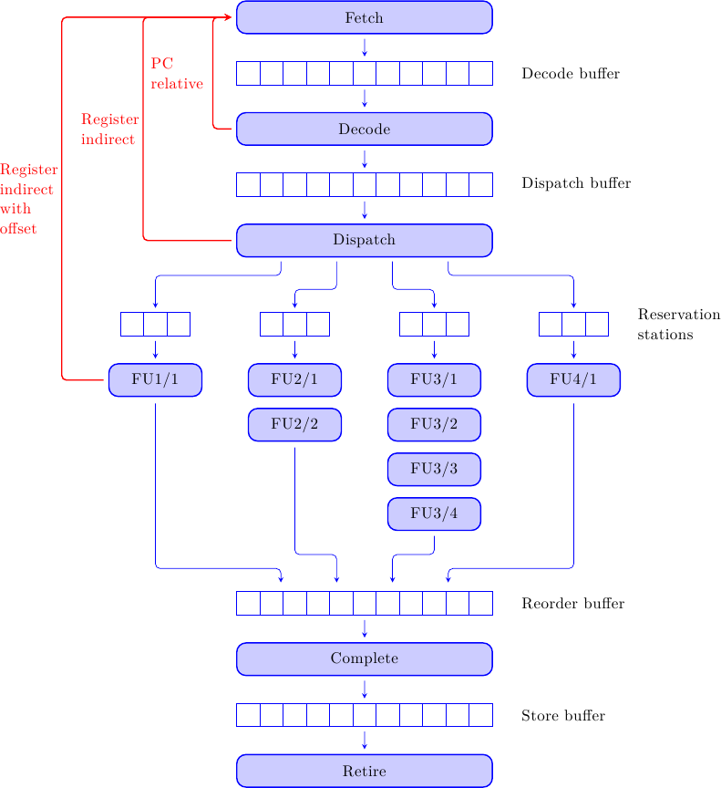 - un buffer con gli indirizzi dei salti che stiamo eseguendo speculativamente: è necessario nel caso una predizione di salto si rivelasse errata e si fosse costretti a tornare indietro e ripetere il salto nella direzione giusta