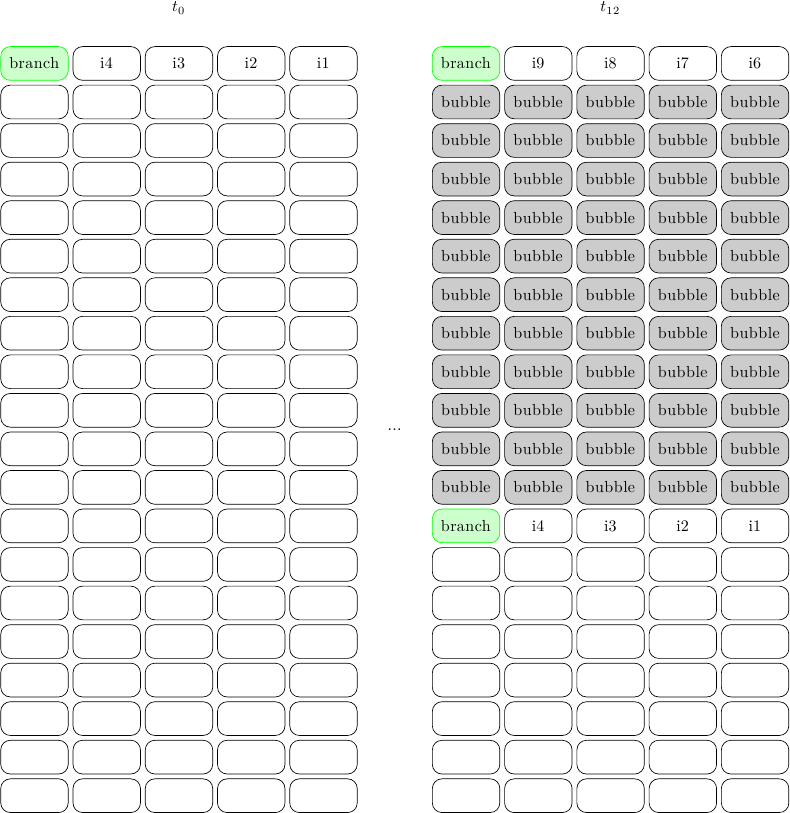 dove il tempo scorre in orizzontale, e per ogni colpo di clock viene mostrato lo stato della pipeline. Le prime 5 istruzioni riempiono l’intera pipeline in 5 colpi di clock, poi due bolle devono essere inserite mentre si aspetta che il branch arrivi all’unità di esecuzione; a questo punto il Program Counter viene settato al valore corretto, e il programma può riprendere. In totale servono 7 cicli di clock (5 utili più 2 bolle) per eseguire il blocco di 5 istruzioni, cioè un IPC (Instruction Per Clock) di 5 / 7 = .71