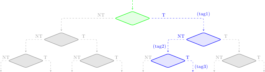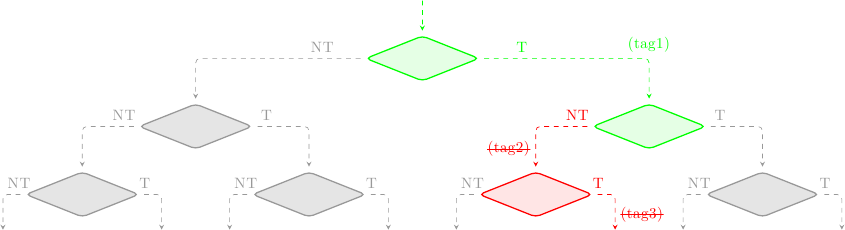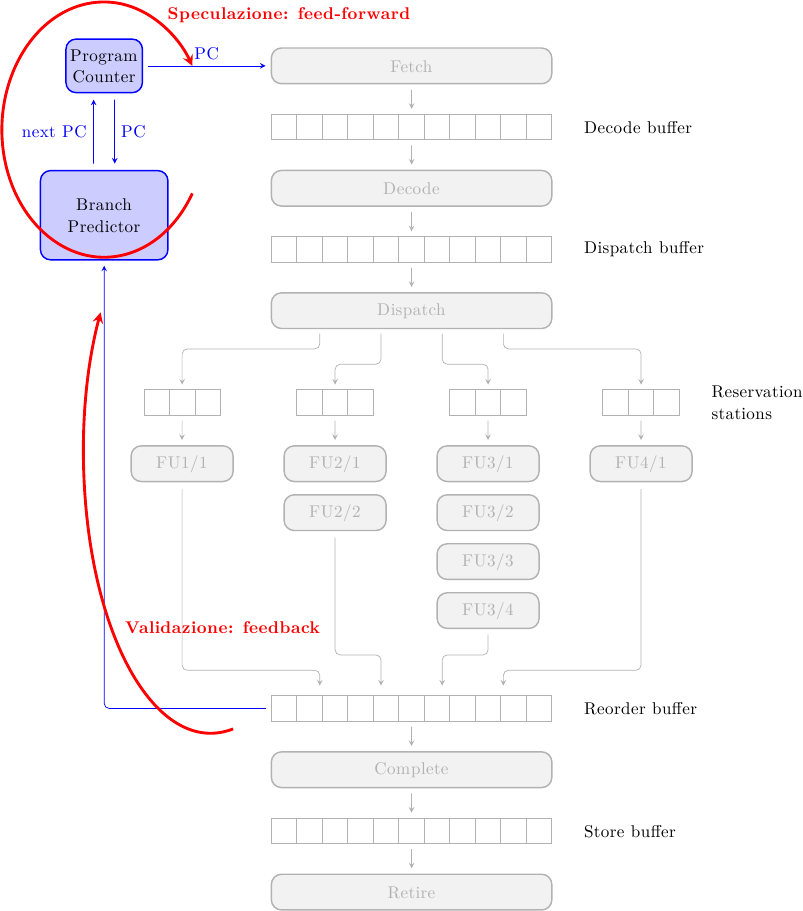 dove ho indicato in verde i blocchi validati (cioè corretti), in blu i blocchi in esecuzione speculativa, in rosso i blocchi speculati erroneamente, e in grigio i blocchi scartati dal predittore. Ad ogni rombo corrisponde un salto. Le istruzioni prima del primo salto non stanno eseguendo speculativamente, e quindi non hanno alcuna tag. Le istruzioni che seguono il primo salto (o meglio, che seguono l’indirizzo bersaglio del primo salto, visto che la predizione è “salto preso”) hanno la tag 1, e così via.