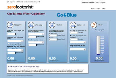Questo calcolatore, basato su un precedente software sempre di Zerofootprint, l’One Minute Carbon Footprint Calculator, che misura la quantità di anidride carbonica rilasciata nell’atmosfera dagli utenti durante le normali attività quotidiane.