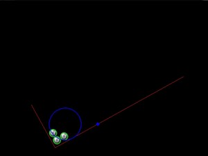 - def run(): inizializziamo pygame, carichiamo l’immagine della palla e creiamo un orologio per il tempo di gioco. Inizializziamo pymunk ed un spazio con gravità dove potremo aggiungere i notri oggetti. Creiamo due liste per tenere conto delle figure da renderizzare sullo schermo. Tra gli eventi che controlliamo, abbiamo quello del tasto sinistro del mouse, che ha il compito di creare una palla nel punto dove siamo e di aggiungerla sia alla lista degli oggetti da renderizzare, sia allo spazio pymunk da noi creato. Il loop principale è molto semplice: si rende lo schermo nero e si crea una lista delle sfere che escono fuori dalla visuale (non vogliamo sprecare troppe risorse calcolando oggetti fisici fuori dallo schermo). Quindi se la coordinata ‘y’ di una sfera è minore di 0 nello spazio pymunk, si può aggiungere a quelle da rimuovere, altrimenti la si renderizza sullo schermo. L’altro ciclo rimuove la sfera dallo spazio e quindi anche dalla lista. Disegnamo poi le due linee (che formeranno la nostra ‘L’) e i due cerchi che rappresentano i nostri vincoli che abbiamo imposto in precedenza. Infine facciamo avanzare di uno step corrispondente a (1/60.) la simulazione nello spazio pymunk e di conseguenza aggiorniamo lo schermo per poi richiamare il tick dell’oggetto clock di pygame a 60 fps. L’ultima riga serve per vedere gli fps sulla barra del titolo della finestra.