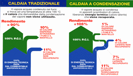 Tutto ciò non toglie che le caldaie a condensazione, in virtù del recupero di calore superiore rispetto ad una equivalente caldaia tradizionale, permettano di ottenere migliori prestazioni energetiche ed emissioni e consumi inferiori.