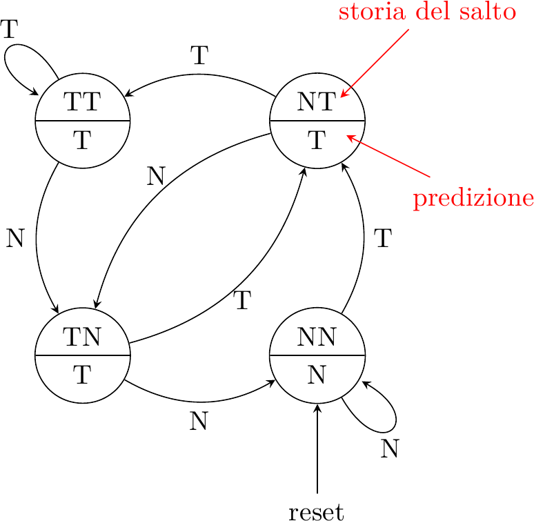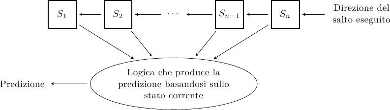 Il modo più semplice per predire la direzione di salto è costruire una macchina a stati finiti (FSM) che tiene traccia degli ultimi N esiti del salto (1 bit per esito): la macchina avrà 2^N stati, e ad ogni stato è associata una predizione: