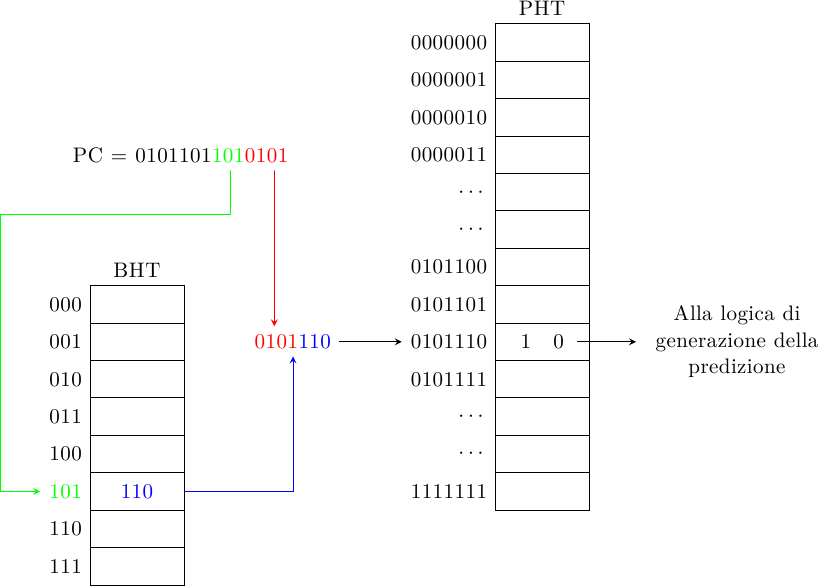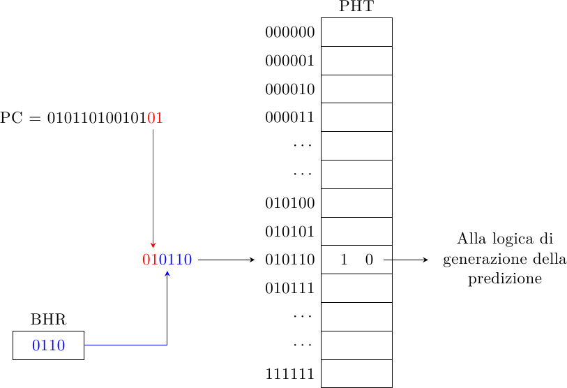 Il Branch History Register (BHR) è uno shift register dove vengono accumulati i risultati degli ultimi N branch (qualunque essi siano). Il BHR tiene traccia quindi della storia globale, il percorso di istruzioni che ci ha portati al salto in esame; la Pattern History Table (PHT) è una collezione di predittori indicizzata tramite una concatenazione della storia globale con (una parte del) l’indirizzo del salto in esame: in questo modo è possibile fare predizioni diverse per lo stesso salto a seconda del code path che ci ha portati lì. Questo schema è chiamato Global History 2-Level Predictor.