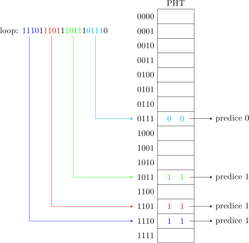 dove ho indicato con ‘1’ un salto preso e con ‘0’ un salto non preso: si alternano successivamente tre 1 e uno 0. Dopo un certo numero di ripetizioni del loop, il predittore ha imparato che se la storia locale contiene un salto non preso e tre presi il prossimo sarà non preso, e sarà preso negli altri casi. Il tempo di “addestramento” di questo schema è superiore (deve “imparare” lo schema di ripetizione sia della storia locale che dei predittori, in totale 4 + 4 * 2 = 12 bit di informazione invece che 2), ma la capacità predittiva è migliore. In questo caso, il predittore ha una precisione del 100%, dove gli schemi precedenti si fermavano al 50% e al 75% rispettivamente.