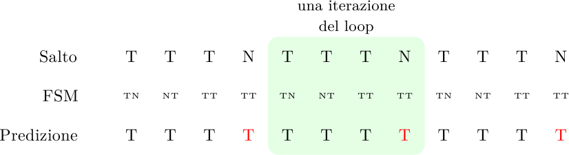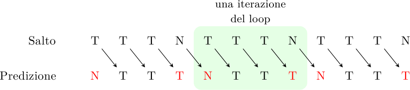 Il predittore predice un salto preso in 3 stati su 4: solo se gli ultimi due esiti sono stati non-preso, allora predirà non-preso. Confrontiamo il comportamento di questo predittore con quello del predittore a 1 bit, sullo stesso loop: