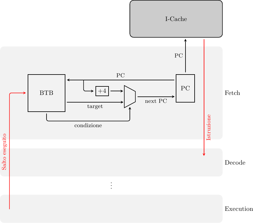Il Program Counter corrente viene usato quindi per accedere contemporamente alla Instruction Cache e al predittore, per ottenere il prossimo PC. Lo stadio di Fetch assomiglierà allora a qualcosa del genere: