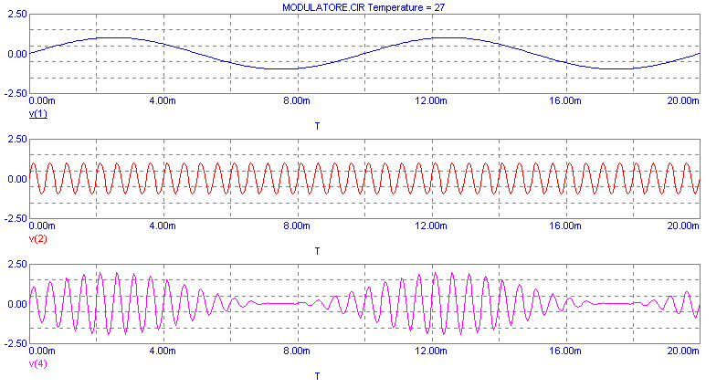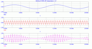 Il primo grafo rappresenta un onda (modulatore) che codifica un segnale, ad esempio la nostra sequenza di bits che identifica la stringa contenuta nella memoria del tag, che contiene l’informazione da trasmettere e che possiede una certa frequenza ed una certa ampiezza. Il secondo grafo è l’onda portante, ossia quella famosa onda, ad esempio di 13,56 Mhz, che tanto abbiamo tirato in ballo finora e che costituisce il mezzo di trasporto dell’informazione. L’ultimo grafo è il risultato del processo di modulazione, ossia un’onda che ha la frequenza della portante ma un’ampiezza che varia in base all’onda modulatrice e quindi al messaggio contenuto.