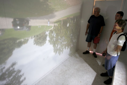La camera oscura in questione è, fondamentalmente, una sorta di grande scatola, all’interno della quale ci si può camminare agevolmente, con un obiettivo a vetro singolo che proietta un immagine delle attività esterne su una parete bianca. Il tutto, ovviamente, a bassissimo impatto ambientale.