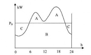 Dall’esame di questo diagramma si può individuare un “Carico di Base PB” (indicato con B) che rappresenta grossomodo il carico medio, al di sopra del quale si individuano principalmente due picchi di richiesta (indicati con A) e due “eccedenze” del carico di base rispetto alla richiesta (indicate con C), il tutto in funzione dell’ora del giorno (indicata in ascissa).