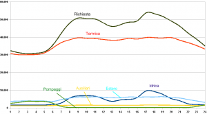 Analizzando una giornata tipo (20/12/2006) si può vedere come si suddivida la produzione energetica tra le varie fonti (le fonti termoelettriche sono rappresentate complessivamente):
