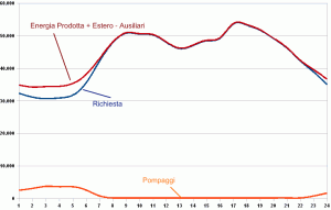 Si può notare come una certa sovrapproduzione sia presente durante le ore notturne, ed essa venga impiegata per il pompaggio dell’acqua dai bacini di valle ai bacini di monte, in modo da potere disporre della massima capacità di regolazione istantanea durante il giorno.