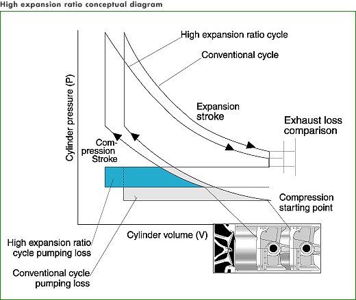 Pur disponendo di un elevato rapporto di compressione geometrico, in virtù dell’anticipata chiusura delle valvole di aspirazione durante la fase di aspirazione stessa, oppure della ritardata chiusura di queste durante la fase di compressione, permette di “mostrare al fluido” un rapporto di compressione inferiore rispetto a quello geometrico, consentendo pertanto di avere un rapporto di espansione superiore rispetto a quello di compressione effettivo.