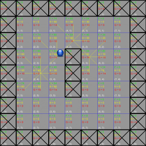 Il programma potrà essere riutilizzato per una visione isometrica, visto che la parte grafica è completamente staccata dal meccanismo della ricerca del percorso. Infatti si può “lavorare” sui nodi (le nostre piastrelle nell’esempio dell’isometria, per intenderci) come se fossero parti della mappa esistente o semplicemente facendogli formare una mappa specchio, che viede utilizzata solo per questa ricerca. In questo esempio, la mappa sarà creata e gestita come abbiamo visto per l’isometria (quindi con un array), ma graficamente scarna per far intravedere il lavoro che avviene durante la ricercare del percoso più breve.