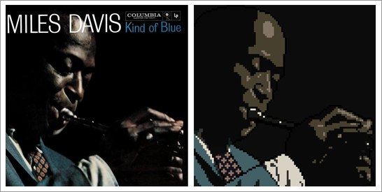 Un musicista decide un bel giorno di reinterpretare con le sonorità dei sistemi 8 bit degli anni ’80 Kind of blue (1959) di Miles Davis, uno dei più famosi album della storia del jazz. L’album si chiama Kind of bloop e la copertina, coerentemente con l’ispirazione, non è nient’altro che la versione pixelata di quella originale.