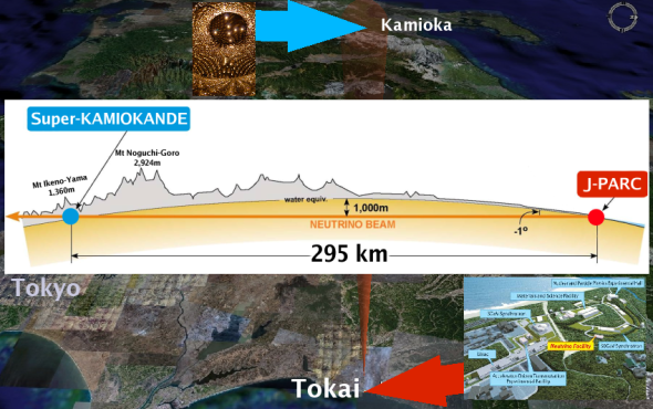 Fin qui possiamo anche accettarlo, ma ci sono altre cosa da comprendere. Tramite l’osservazione di neutrini solari e neutrini atmosferici si è riusciti a porre dei limiti molto restrittivi sulla differenza tra le masse dei neutrini presi a coppie (1-2, 2-3). Inoltre la probabilità di un neutrino di oscillare verso un altro neutrino dipende dal sapore del neutrino: non è sempre uguale per tutti. Attualmente uno dei maggiori sforzi per lo studio delle proprietà fisiche dei neutrini è fatto dall’esperimento T2K (Tokai-to-Kamioka), in Giappone. Il recente acceleratore di protoni presente in Giappone (J-Parc) produce anche un fascio di muoni, degli elettroni più pesanti che decadono in elettroni, producendo anche neutrini. Si ha quindi un fascio collimato di neutrini che arriva fino alla montagna di Kamioka, dove il rivelatore di Super Kamiokande può studiare queste particelle, come si può capire dalla figura qui sotto.