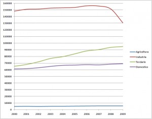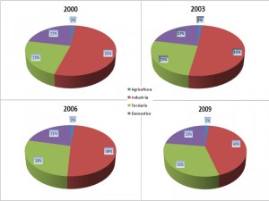 Dal primo dei due diagrammi si vede chiaramente come in termini percentuali (e sostanzialmente “qualitativi” in quanto dati non normalizzati) l’influenza del settore domestico appare grossomodo costante e non preponderante, mentre a farla da padrona sono i consumi del settore industriale (in forte calo percentuale) e terziario.