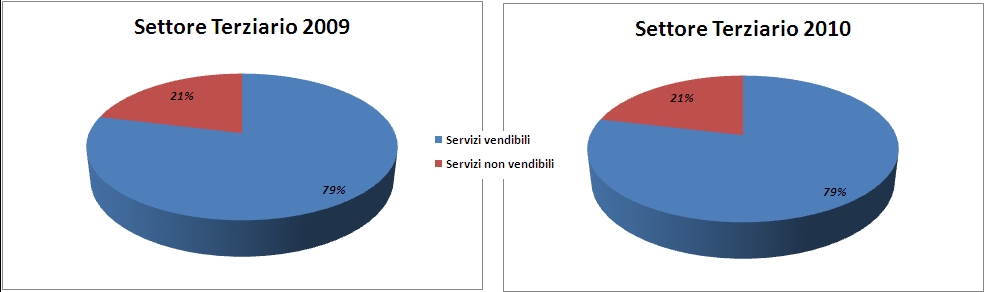 Sullo scenario della variazione delle percentuali delle varie voci del settore terziario non si notano sostanziali variazioni tra il 2009 ed il 2010, così come invariata rimane la ripartizione tra servizi vendibili e servizi non vendibili: