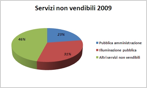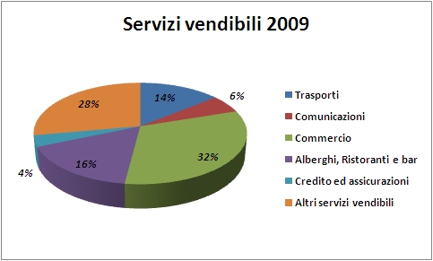 Sullo scenario della variazione delle percentuali delle varie voci del settore terziario non si notano sostanziali variazioni tra il 2009 ed il 2010, così come invariata rimane la ripartizione tra servizi vendibili e servizi non vendibili:
