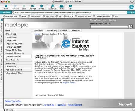 La nuova strategia di rete si concretizza anche nella decisione di smarcarsi da Microsoft sul versante browser dando un forte impulso allo sviluppo di Safari e relegando nell’angolo il supporto a Internet Explorer per Mac, fino ad ora l’unico browser disponile per Mac OS X.