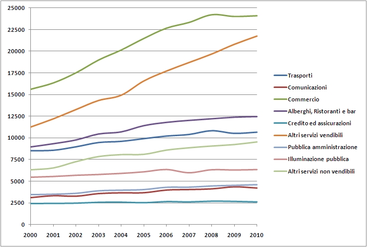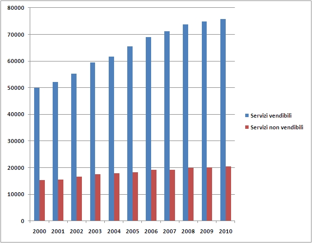 Tale andamento sempre crescente, a differenza da quanto avvenuto per il settore industriale, risulta trainato come appena detto dalla categoria dei servizi vendibili, e principalmente dalle voci Commercio e Altri servizi vendibili.