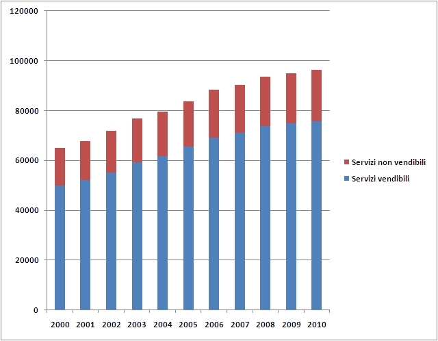 Questo primo grafico evidenzia un andamento sempre crescente dei consumi per entrambe le categorie, ma appare evidente come la categoria dei servizi vendibili rappresenti una minima parte del totale (come mostrato nel precedente post, circa il 21% del totale riferito agli anni 2009 e 2010) che è andata via via proporzionalmente riducendosi a causa di un suo incremento assoluto molto ridotto a confronto con categoria dei servizi vendibili.