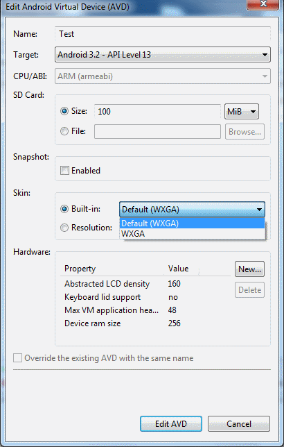 All’apparenza non ci sono molte voci, ma le tre più importanti (Target, Skin, e Hardware) sono sufficienti a complicarci la vita, presentando numerose opzioni / possibilità. La più importante, che abbiamo già avuto modo di conoscere, è la prima, che consente di specificare quale versione delle API (nel gergo di Android, “API Level“) vogliamo utilizzare: