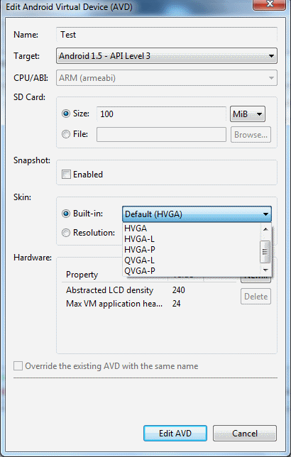 Senza entrare troppo nei dettagli, una buona base di partenza per comprendere il concetto è rappresentata dalla finestra che si apre quando si decide di creare (o modificare) una nuova macchina virtuale (Android Virtual Device, abbreviato con AVD) sulla quale far girare il nostro codice: